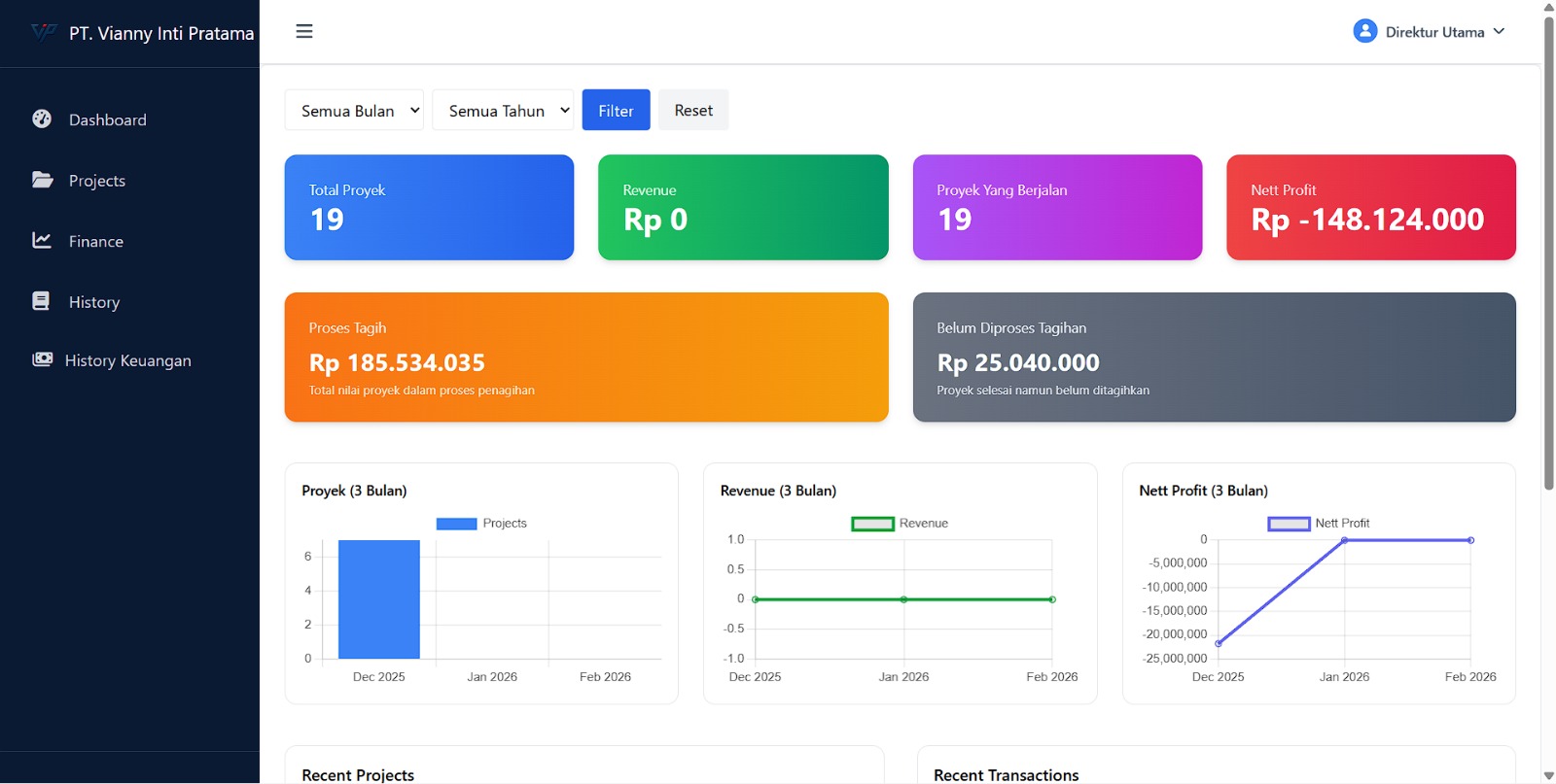 Dashboard admin PT. Vianny Inti Pratama untuk menghandle progress harian mandor & keuangan proyek.